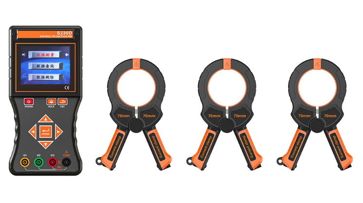 S230D 三相智能相位伏安表 是一款專為現場測試的多功能智能儀表,由 主機 、 電流鉗 (3 把 ) 、 測試線 (4 條 ) 等組成。主機采用 3.5 寸真彩液晶屏,圖形菜單界面顯示,向量圖指示,一目了然。選用大口徑電流鉗能測試 1000A 電流。儀表可以在被測回路不開路的情況下,同時測量三相交流電壓、電流、電壓間相位、電流間相位、電壓電流間相位、頻率、相序、有功功率、無功功率、視在功率、功率因數、電流矢量和,判別變壓器接線組別、感性、容性電路,測試二次回路和母差保護系統,讀出差動保護各組CT之間的相位關系,檢查電度表的接線正確與否,檢修線路設備等,為用電檢查人員提供一種安全、準確、便捷的智能儀表。適用于電力、石油化工、冶金、鐵路、氣象、工礦企業、科研院校、計量部門等。尤其適用于大功率三相電機、電能計費系統及繼電保護系統的電參數測試。