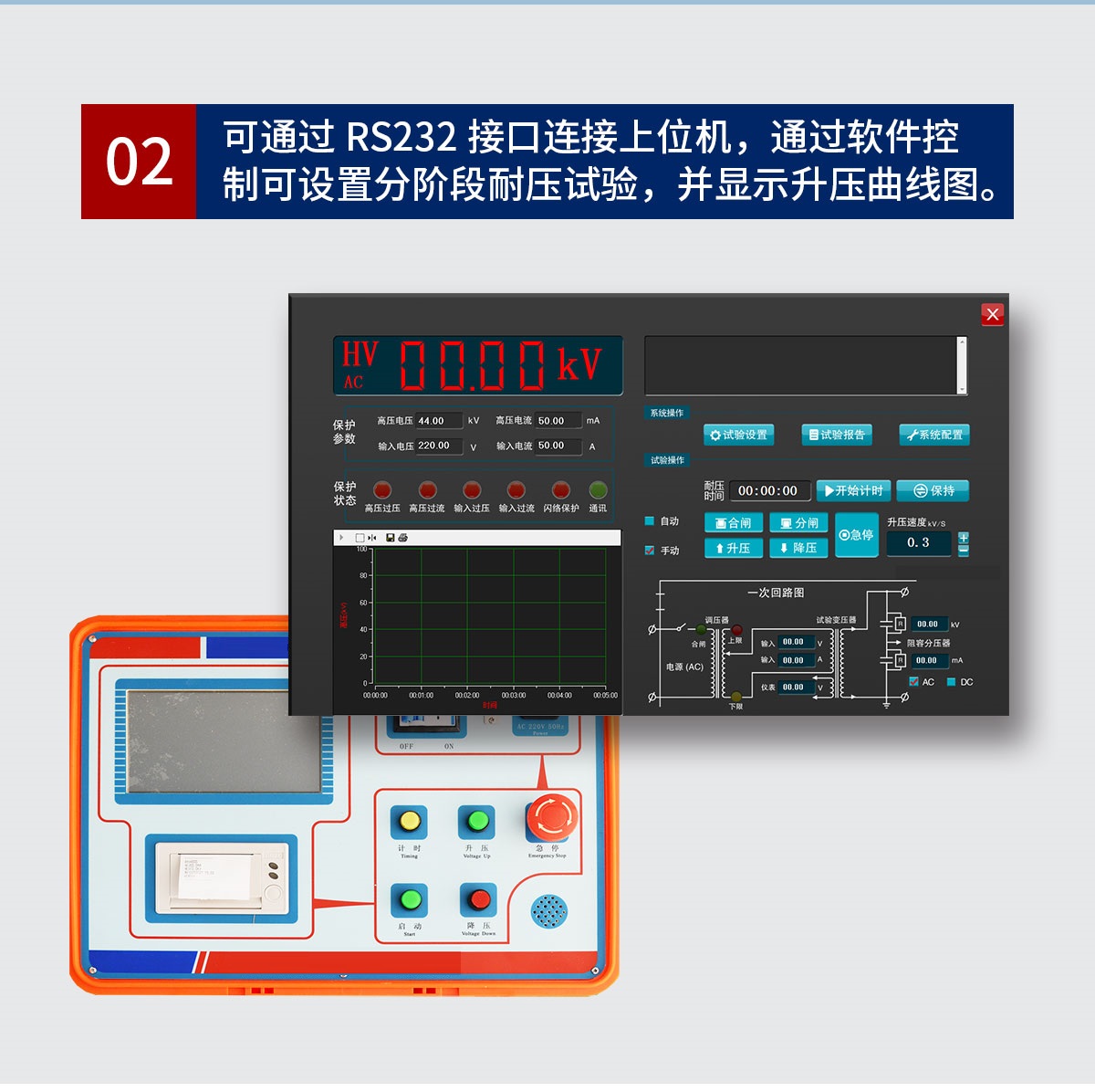 15、可通過RS232接口連接上位機,通過軟件控制可設置分階段耐壓試驗,并顯示升壓曲線圖。
