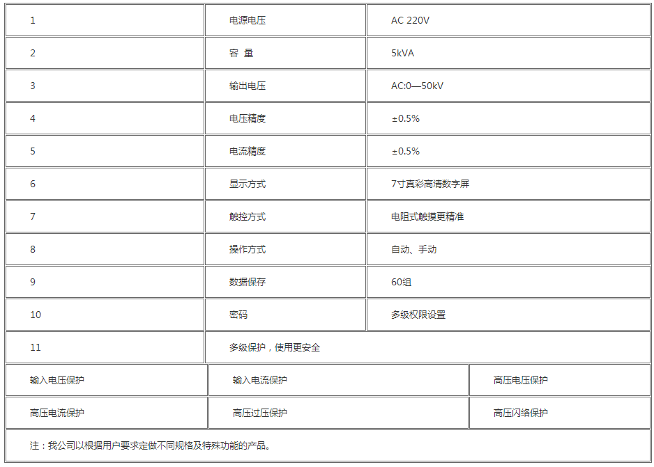 9、自動計時功能。自動控制時,當電壓自動上升至設定值時,設備自動開始計時,當計時時間到,顯示試驗結果,設備自動回到零位;