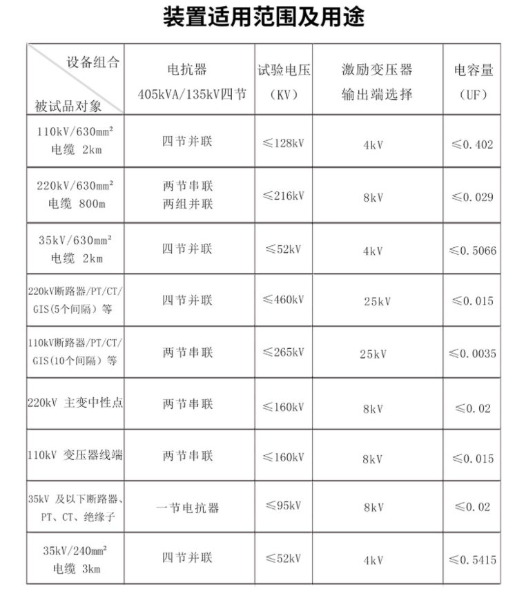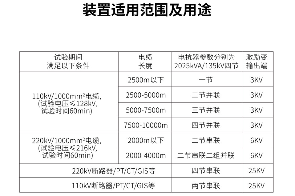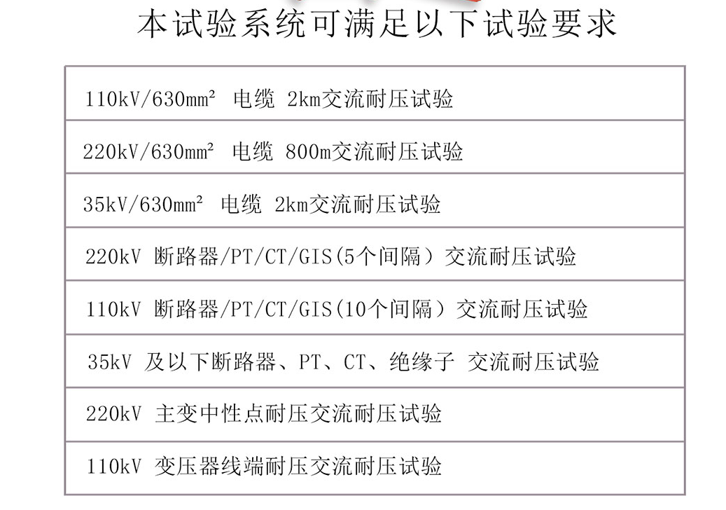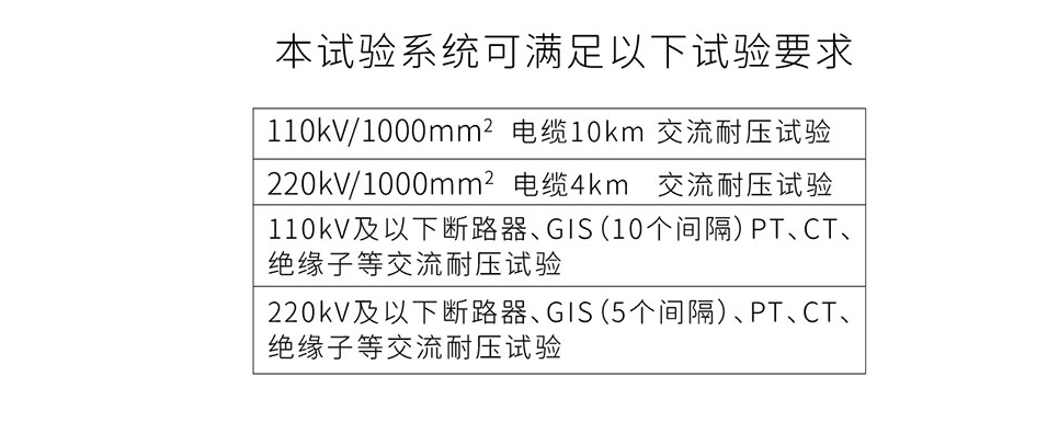 主要針對110kV/300mm2電纜0.5km,35kV/300mm2電纜2km、10kV/300mm2電纜5km、110kV/63000kVA主變中性點、110kV 開關,35kV 開關、GIS的交流耐壓試驗設計制造。具有較寬的適用范圍,是地、市、縣級高壓試驗部門及電力安裝、修試工程單位理想的耐壓設備。