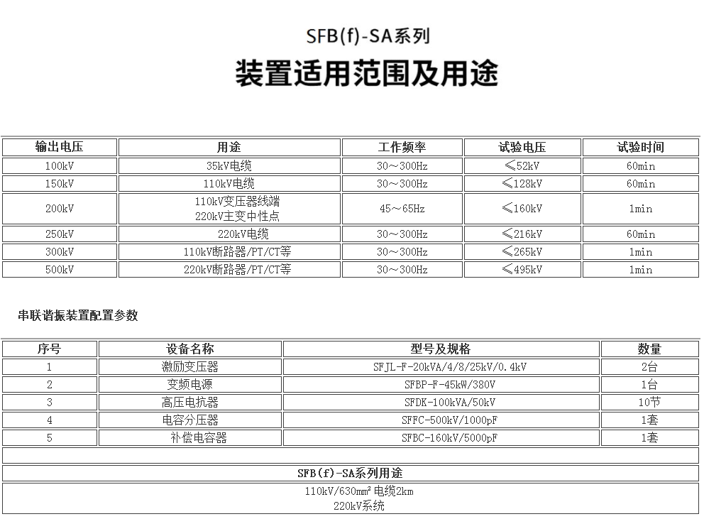 適用于110kV/63000kVA主變、66kV/86000kVA主變、10kV/300mm2電纜2km、66kV開關、母線、66kV/630mm2電纜0.2km的交流耐壓試驗。具有較寬的適用范圍,是地、市、縣級高壓試驗部門及電力安裝、修試工程單位理想的耐壓設備。