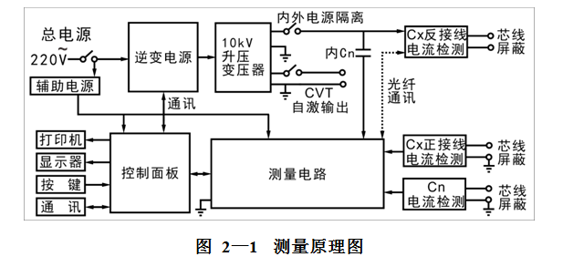在交流電壓作用下,電介質要消耗部分電能,這部分電能將轉變為熱能產生損耗。這種能量損耗叫做電介質的損耗。當電介質上施加交流電壓時,電介質中的電壓和電流間成在相角差ψ,ψ的余角δ稱為介質損耗角,δ的正切tgδ稱為介質損耗角正切。tgδ值是用來衡量電介質損耗的參數。儀器測量線路包括一標準回路(Cn)和一被試回路(Cx),如圖2—1所示。標準回路由內置高穩定度標準電容器與測量線路組成,被試回路由被試品和測量線路組成。測量線路由取樣電阻與前置放大器和A/D轉換器組成。通過測量電路分別測得標準回路電流與被試回路電流幅值及其相位差,再由數字信號處理器運用數字化實時采集方法,通過矢量運算得出試品的電容值和介質損耗正切值。儀器內部已經采用了抗干擾措施,保證在外電場干擾下準確測量。