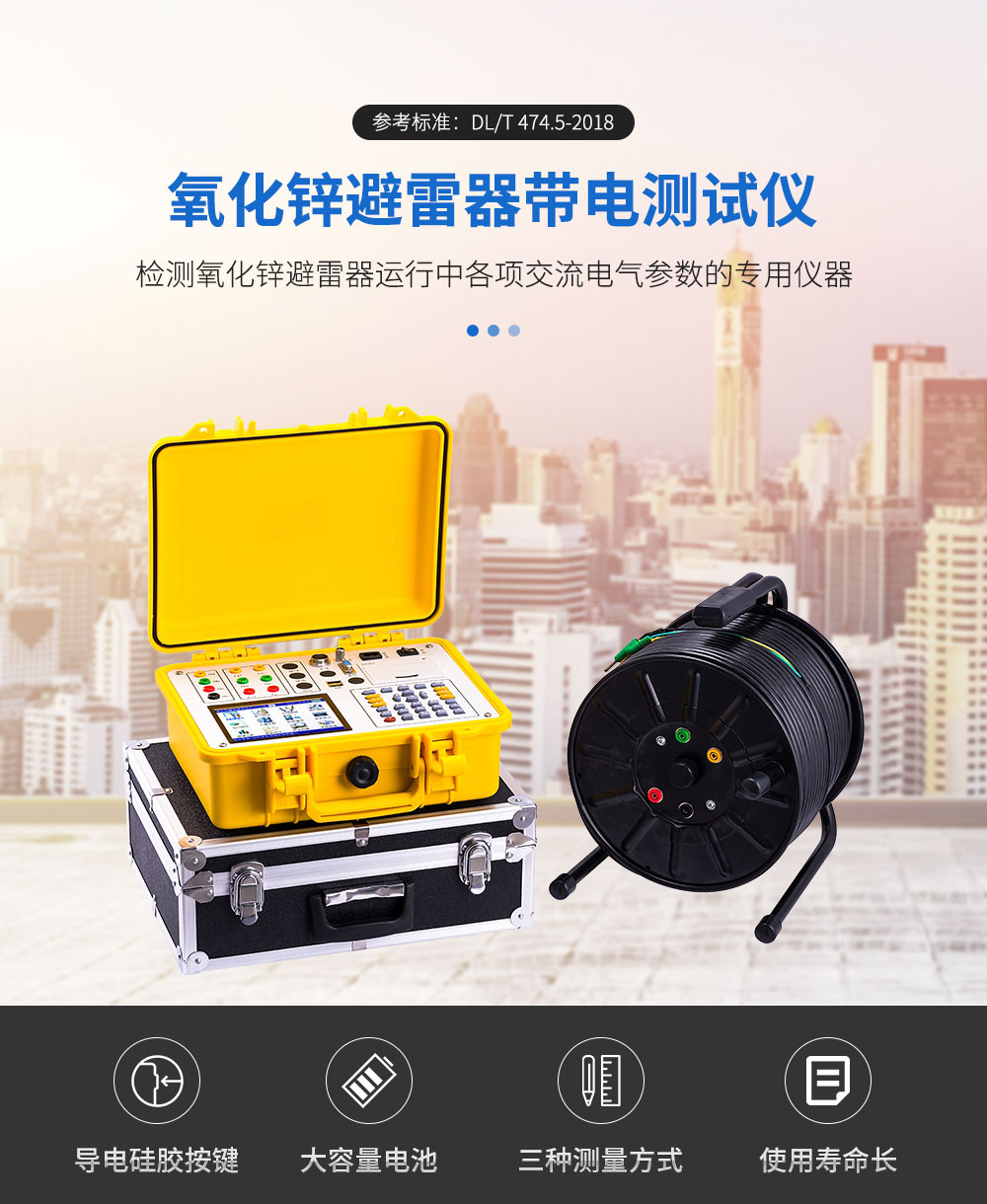 氧化鋅避雷器是用來保護(hù)電力系統(tǒng)中各種電器設(shè)備免受過電壓損壞的電器產(chǎn)品,具有良好保護(hù)性能。為了檢驗氧化鋅避雷器的性能是否正常,我們適時開發(fā)了氧化鋅避雷器測試儀,這是一種用于現(xiàn)場和實驗室檢測避雷器各項相關(guān)電氣參數(shù)的專用儀器,廣泛應(yīng)用于氧化鋅避雷器的現(xiàn)場在線監(jiān)測(帶電測試)和實驗室(停電檢修)的測試中。符合中華人民共和國電力行業(yè)標(biāo)準(zhǔn)《DL474.5—92現(xiàn)場絕緣試驗實施導(dǎo)則—避雷器試驗》的要求。本儀器采用了高速微電腦控制的高精度采樣、處理電路,先進(jìn)的傅立葉諧波分析技術(shù),確保數(shù)據(jù)的可靠性。可測量氧化鋅避雷器在工頻電壓下的全電流、阻性電流、三次諧波電流、五次諧波電流、七次諧波電流、一次電壓、有功功率及電壓與電流的相位差角等。以判斷MOA絕緣受潮和閥片老化程度。電壓測量信號無線傳輸,避免了因避雷器與PT距離遠(yuǎn)而需要鋪設(shè)長距離電壓測量線的麻煩。設(shè)備采用大屏幕彩色液晶屏顯示,全漢字菜單提示操作及打印輸出。使人機(jī)交換功能更強(qiáng)。本儀器具有接線簡單、測量精度高、可靠性強(qiáng)等特點(diǎn)。
