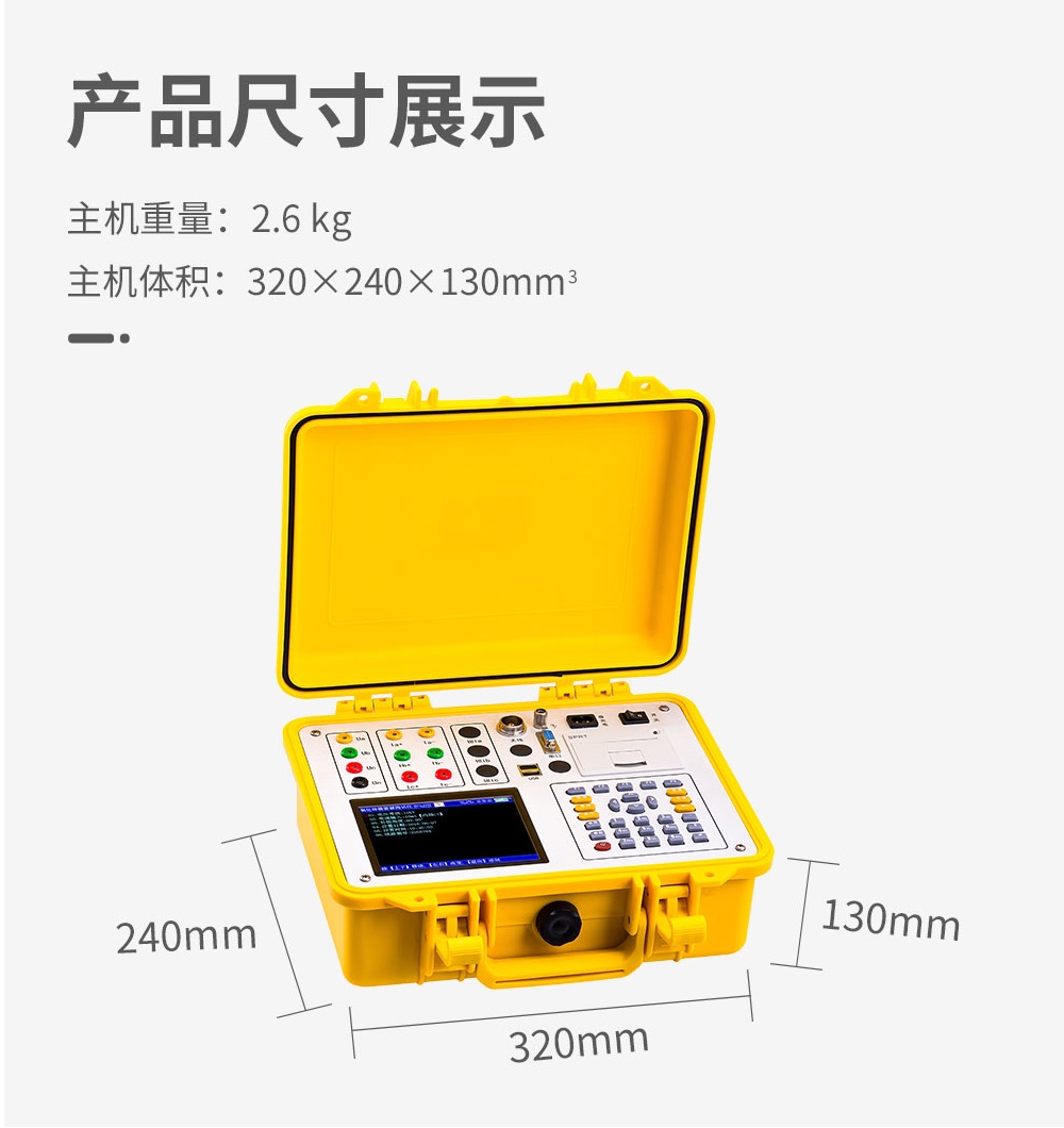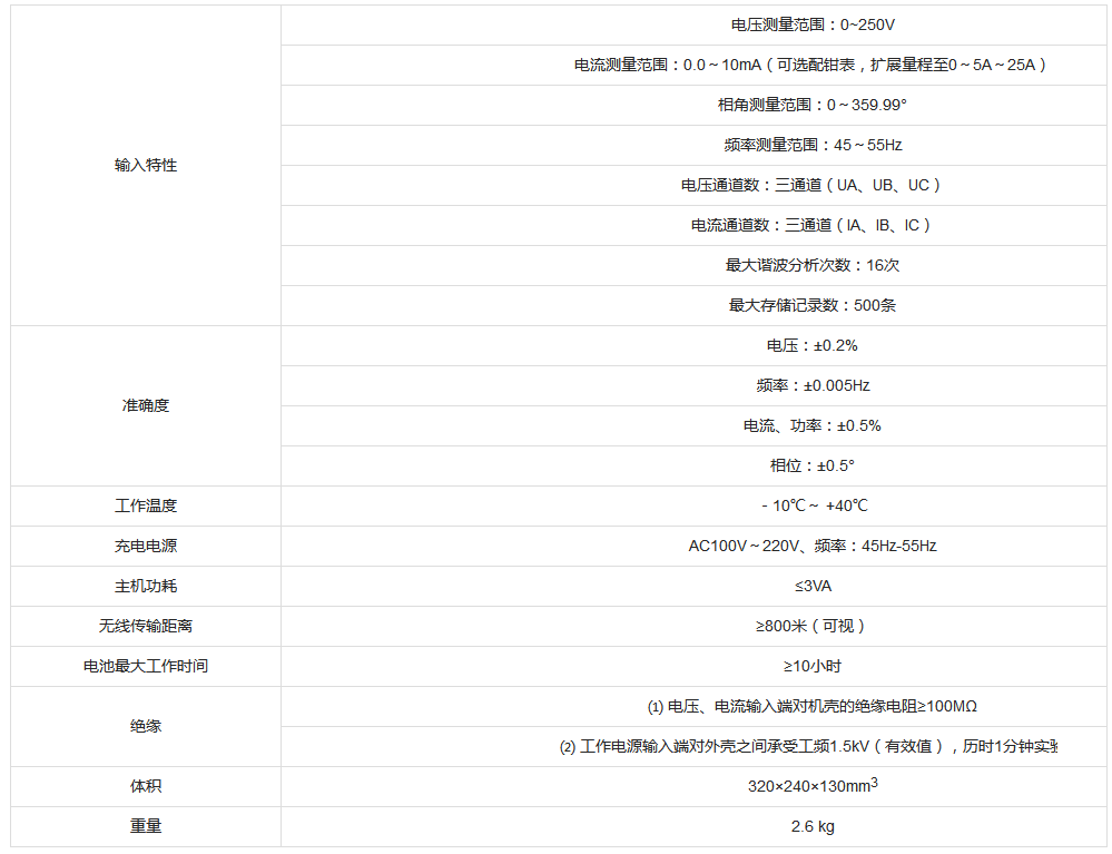 輸入特性電壓測量范圍:0~250V電流測量范圍:0.0~10mA(可選配鉗表,擴(kuò)展量程至0~5A~25A)相角測量范圍:0~359.99°頻率測量范圍:45~55Hz電壓通道數(shù):三通道(UA、UB、UC)電流通道數(shù):三通道(IA、IB、IC)最大諧波分析次數(shù):16次最大存儲記錄數(shù):500條準(zhǔn)確度電壓:±0.2%頻率:±0.005Hz電流、功率:±0.5%相位:±0.5°工作溫度-10℃~ +40℃充電電源AC100V~220V、頻率:45Hz-55Hz主機(jī)功耗≤3VA無線傳輸距離≥800米(可視)電池最大工作時間≥10小時絕緣⑴ 電壓、電流輸入端對機(jī)殼的絕緣電阻≥100MΩ⑵ 工作電源輸入端對外殼之間承受工頻1.5kV(有效值),歷時1分鐘實驗體積320×240×130mm3重量2.6 kg