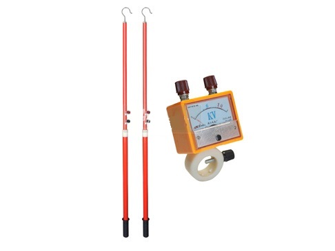 6、特別注意的是在操作時,人體不得接觸核相儀表、高壓連線,人體與核相儀表要保持2.1米的安全距離(將核相儀表放在第二根連接桿上端),接地線要可靠接地。同時人體與高壓連線也要保持足夠的安全距離(2.1米)(請嚴格按照核相器試驗操作規程的要求進行操作核相)。連接兩根測試竿的測試線為普通220V導線,在核相時人體不得接觸或近距離接觸該導線。使用時應將過長的導線用扎帶扎在第一根測試竿上,同時離人體要有足夠的安全距離(請參照高壓電器操作規程),高壓連線也不得與大地接觸。