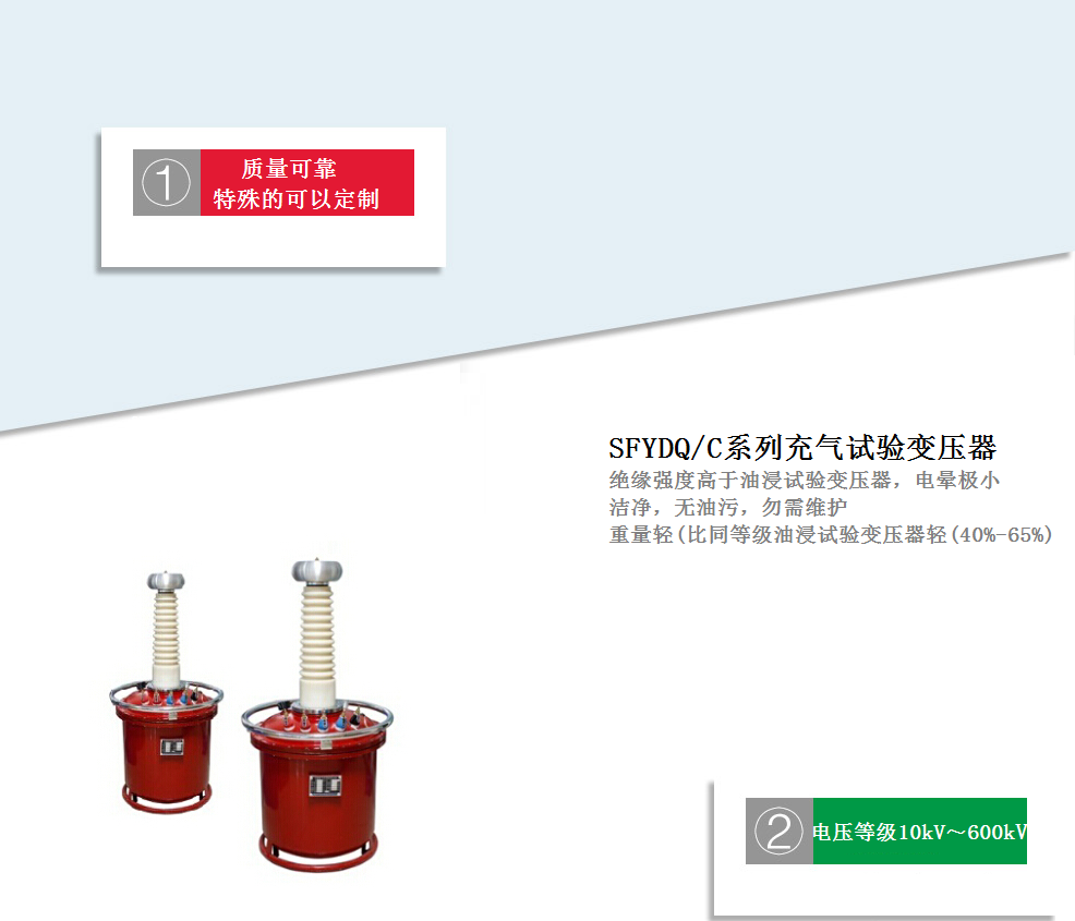 四方國瑞電力公司經過多年的努力,研究成功了充氣式交流試驗變壓器,本系列產品與傳統的油浸式輕型試驗變壓器相比,重量上減輕了20%-60%(視電壓及容量等級而定),而且無油污染,單臺充氣式交流試驗變壓器的電壓等級可達300KV。由于采用了新的生產工藝,產品的技術性能有較大的提高,特別適用于現場工作及頻繁移動的工作條件下使用。