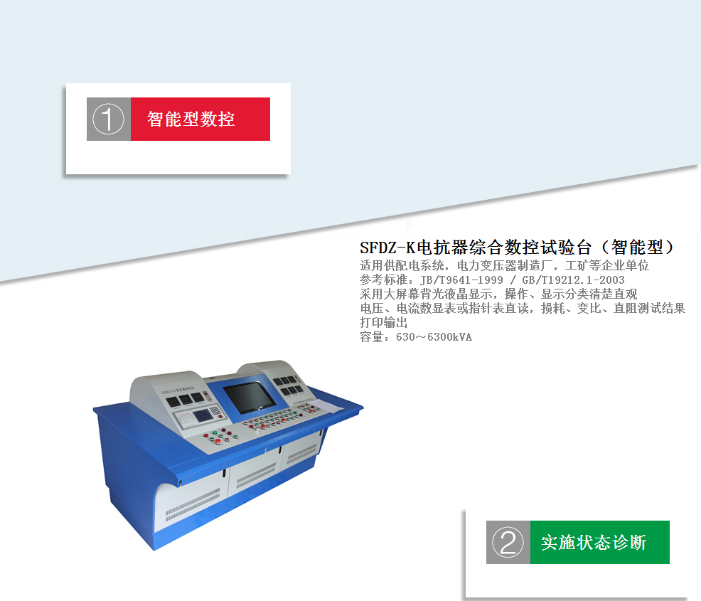 SFDZ系列電抗器綜合數(shù)控試驗臺適用供配電系統(tǒng),電力變壓器制造廠,工礦等企業(yè)單位。變壓器綜合試驗臺能真實地判斷電力變壓器的空載電流,空載損耗,阻抗電壓和負(fù)載損耗,準(zhǔn)確的測量電力變壓器直流電阻,變比,實施狀態(tài)診斷,確保安全運行,為監(jiān)測或修造變壓器提供了可靠的數(shù)據(jù)。