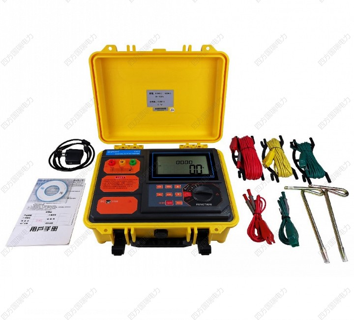 儀器由主機、測試線、輔助接地棒、數據軟件、通訊線等組成。主機專用工具箱式設計,用聚丙烯塑膠作為原料,添加新型復合填充料一次注塑成形,密度小、強度、剛度、硬度、耐磨性、耐熱性、絕緣性能更優越,其箱體能承受約200kg的壓力,確保各種環境測試的高精度、高穩定性和高可靠性。主機超大LCD顯示,具有背光、棒圖指示,一目了然,同時能存儲2000組數據,通過數據軟件可以實現歷史數據讀取、查閱、保存、報表、打印等功能。