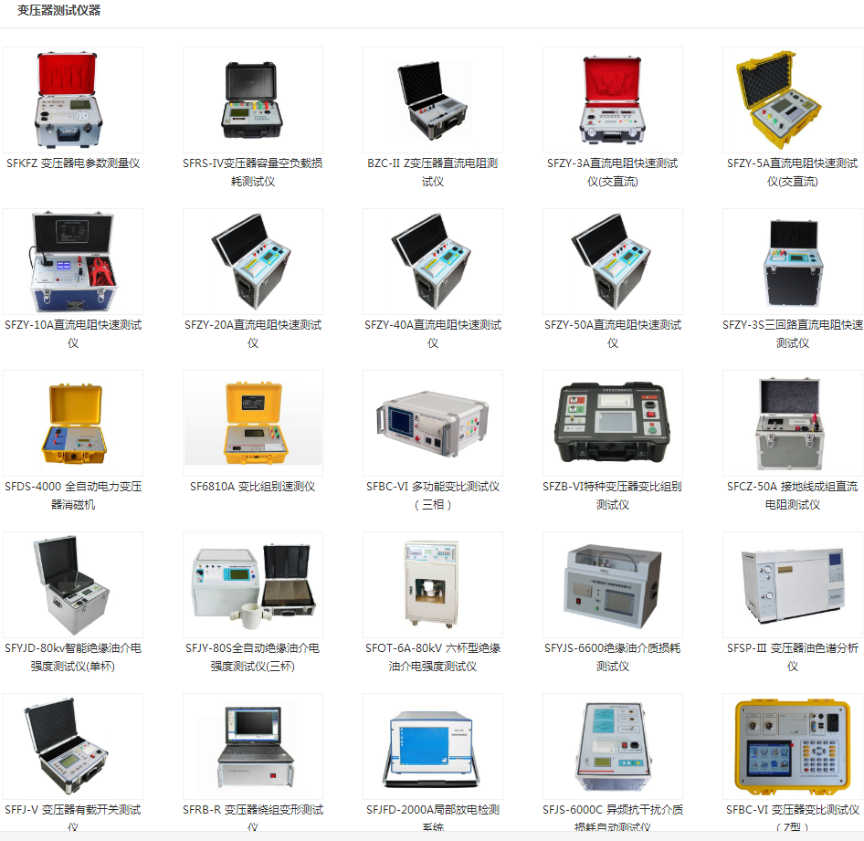 試驗變壓器、工頻耐壓裝置、綜合試驗臺、高壓耐壓設備、串聯諧振、承試設備選型、變壓器測試儀器、繼電保護測試儀、斷路器測試、開關測試儀器、避雷器測試儀器、接地、絕緣電阻測試儀器、互感器檢測及計量儀器、SF6、油化測試儀、蓄電池檢測儀無功補償電容檢測。