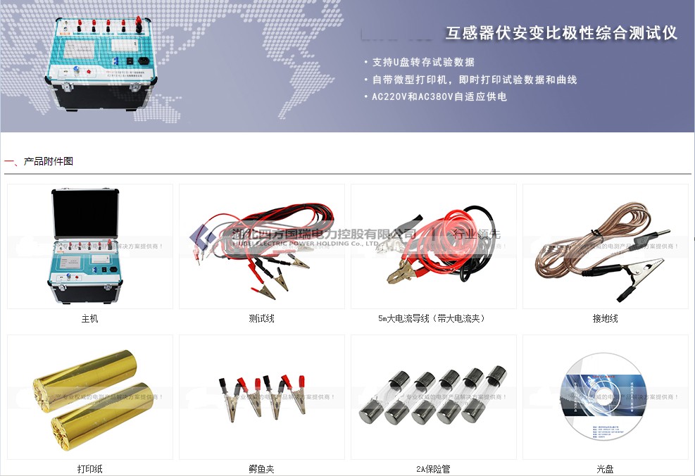 3 可選配件包括外接升壓器,外接升流器,外接調壓器,外接升壓器最高電壓可升至2000V,3A,外接升流器可升至1000A,外接調壓器最大輸出可達1500V,20A,采用外接升壓器時,最高可做500KV等級1A電流互感器的伏安特性試驗。