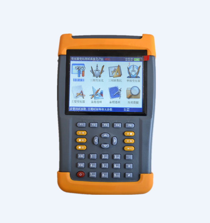 儀器頂端部分是變比測試航空插頭,高壓側,低壓側端子。正面上部是彩色液晶屏,下部是標準30鍵的控制鍵盤;在儀器的右側打開支架可看到USB接口、充電接口、RS232接口。