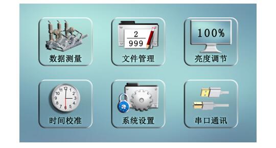 本機液晶顯示屏為1024*600像素的電阻式觸摸彩屏,開機后液晶屏播放完開機動畫后進入主頁菜單界面。主頁有6個功能區按鈕,分別為“數據測量”、“文件管理”、“亮度調節”、“時間校準”、“系統設置”、“串口通訊”點擊按鈕進入相應的操作界面。