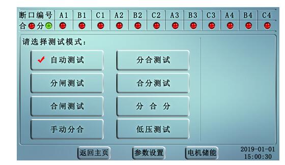 屏幕中部為測試模式選擇區,共提供8種測試模式,分別為“自動測試”、“分閘測試”、“合閘測試”、“手動分合”、“分合測試”、“合分測試”、“分合分”和“低壓測試”。自動測試模式是儀器根據當前的端口狀態自動選擇分閘測試或者合閘測試(12路斷口有1路為合閘狀態時即進行分閘測試)。低壓測試模式是儀器根據當前各斷口的狀態自動判斷進行合閘低跳或者分閘低跳(12路斷口有1路為合閘狀態時即進行分閘低跳)。用戶可根據測試需求及當前的斷口狀態選擇相應的測試模式。點擊模式按鈕后,自動跳轉到相應的操作界面。