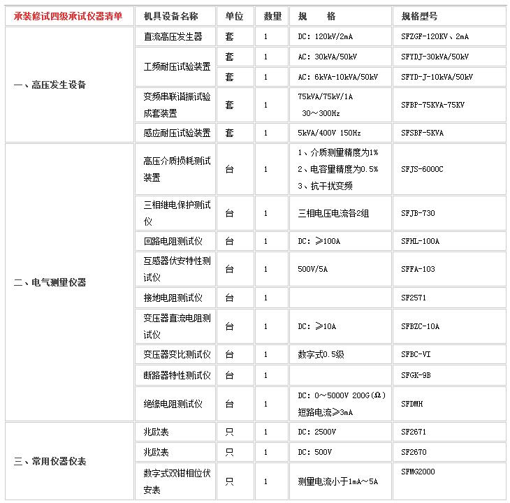 深圳四級承裝承修承試資質設備報價的電力企業想要從事35KV以上的電力承試類活動,需要先取得承試四級資質證書。2017年 12月1日,國家能源局更新了承裝承修承試資質設備清單,全國使用同一份承試資質設備清單,不再有地域 區別,同時還省去了一些不常用的設備,武漢華天電力專業生產承裝承修承試資質設備,提供全套的四級承 裝承修承試資質設備。 深圳四級承裝承修承試資質設備報價選型清單,如下: