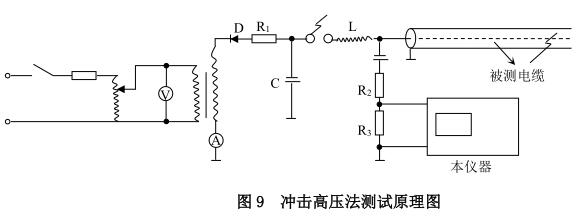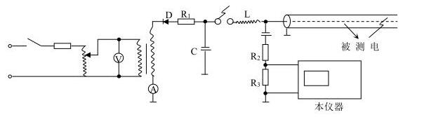 (3)按圖 9 所示線路連接設備。地線按“八、中 2、的 6)”條和“九、中 3、”條要求接好。其中儲能電容 C 要求大于 1μF,耐壓應能滿足試驗要求。其它設備要求與直閃法相同。電感一般取放電球隙中的 2 或 3,也可視被測電纜段的長度或根據反射波形適當增大或減小。
